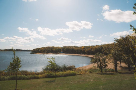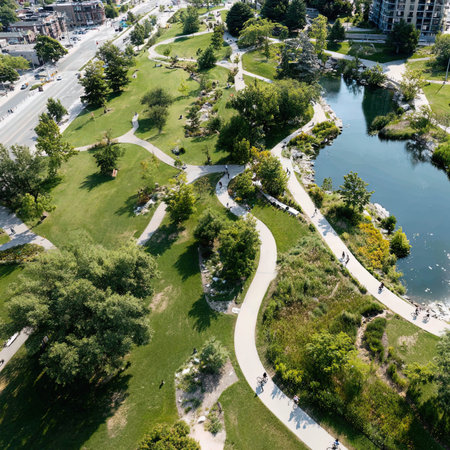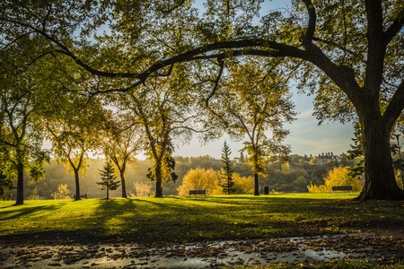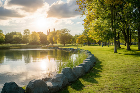 A landscape view of a city park transitioning from the lush greens of summer to the warm tones of autumn