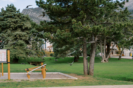 A group of people enjoying leisure activities in a park with a playground, surrounded by natural landscapes, trees, grass, and plants. AIG41