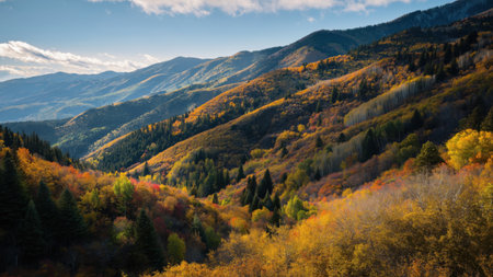 Autumn leaves paint hills beneath a blue sky, created with AI