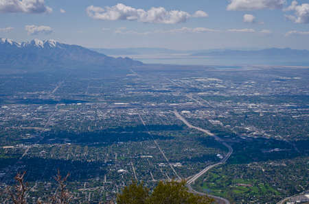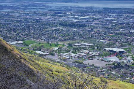 Provo Landscape and Utah Lake views from the Bonneville Shoreline Trail (BST) and the Y trail, which follows the eastern shoreline of ancient Lake Bonneville, now the Great Salt Lake, along the Wasatch Front Rocky Mountains. USA