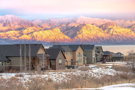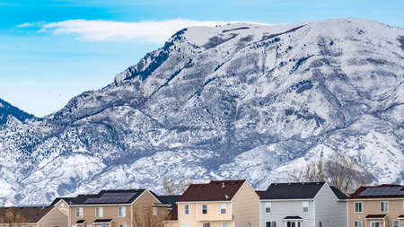Panorama Row of beautiful homes against a rugged mountain dusted with snow in winter