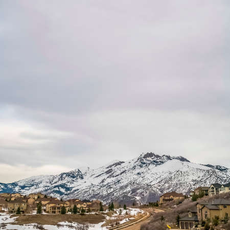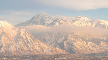 Square frame Snowy Wasatch Mountain and hill top towering over Utah Valley under cloudy sky. The steep peaks of the beautiful mountain is illuminated by golden sunset.