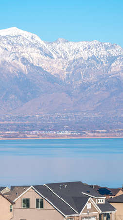 Vertical Picturesque view on Utah lake behind the town in the valley, and beautiful mountains with snow on peaks in winter season