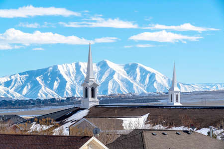 Modern spires of church with steep snowy mountain and sunny blue sky background. Rooftops and distant houses can also be seen in this neighborhood landscape.