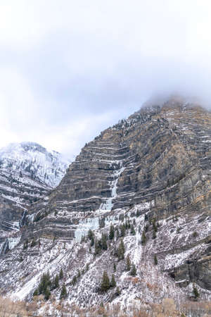 Rugged Provo canyon mountain view with frozen water and snow on the slopes. Puffy white clouds are covering the mountain peak and sky.