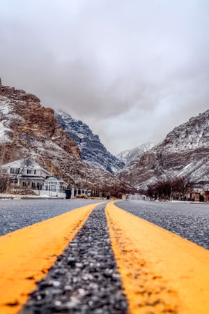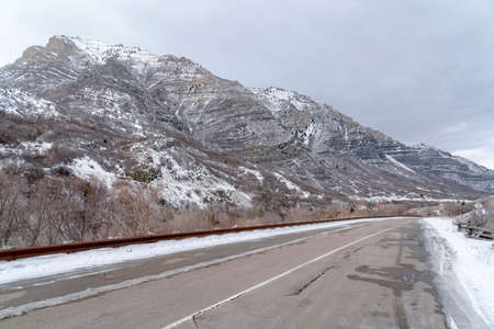 Road along steep snowy mountain in Provo Canyon with cloudy sky background. Highway with stunning view of Utah Valley nature landscape in winter.