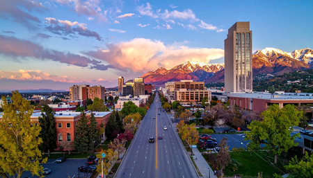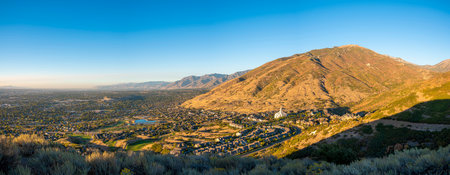 Scenic evening view of the Utah Valley with golden glow on the horizon over the mountains