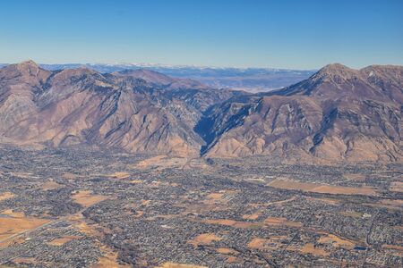 Wasatch Front Rocky Mountain Range Aerial view from airplane in fall including urban cities and the Great Salt Lake around Salt Lake City, Utah, United States of America. USA.