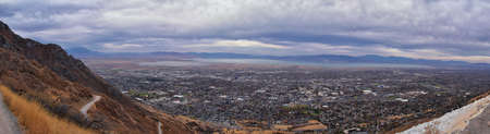 Downtown Salt Lake City View from Little Black Mountain Peak winter snowscape mountain hiking trail views via Bonneville Shoreline Trail, Wasatch Front Rocky Mountains, Utah. United States.