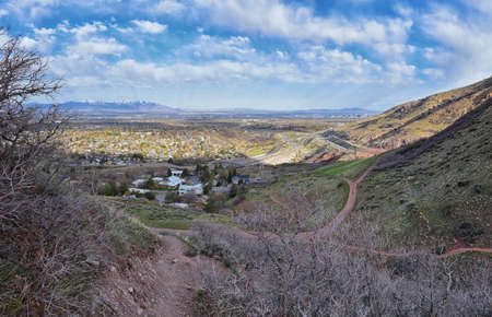 Salt Lake Valley and City panoramic views from the Red Butte Trail to the Living Room, Wasatch Front, Rocky Mountains in Utah early spring. Hiking view of trails around the University and Gardens and downtown. United States.