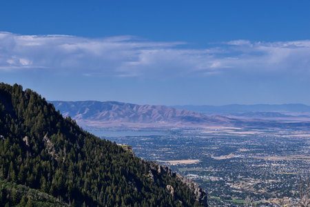 Rocky Mountains landscape views from Grandeur Peak hiking trail, Bonneville Shoreline Pipe Line Overlook Rattlesnake Gulch trail, Wasatch Front, by Salt Lake City, Utah. United States. USA