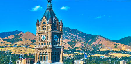 Salt Lake City County Building Clock Tower With Wasatch Mountains Panorama