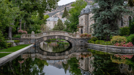 This stunning garden scene features a charming stone bridge reflecting in a calm pond surrounded by lush greenery and beautiful flowers, evoking tranquility.