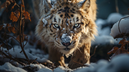 Snow nature. Lynx face walk. Winter wildlife in Europe. Lynx in the snow, snowy forest in February. Wildlife scene from nature, Slovakia. Winter wildlife in Europe. AI Generated.