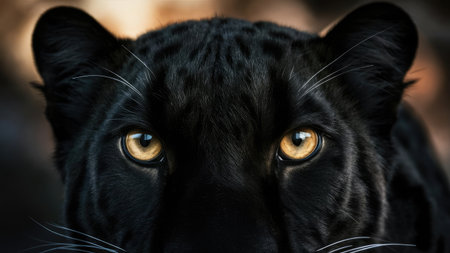 A close up of a black panther's face with yellow eyes. The image has a dark and mysterious mood, with the panther's eyes staring directly at the viewer