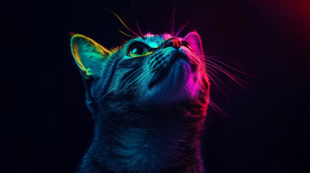 Cat with colorful neon lights looking upwards in a dark background. Modern art and digital illustration concept