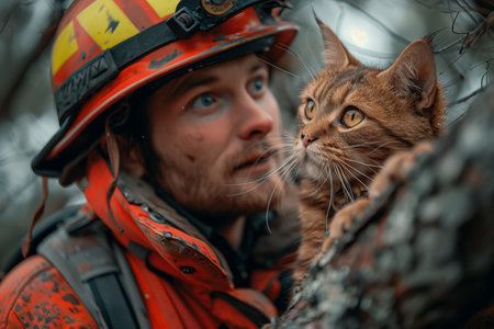 Businessperson in a suit holds a safety rope while a cat jumps towards them outdoors
