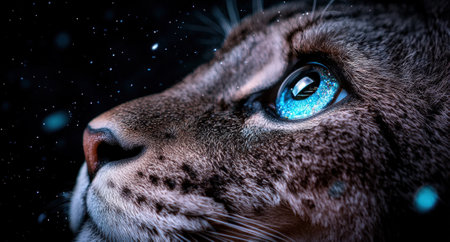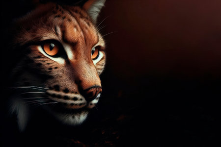 Close-up portrait of a lynx with bright eyes on a dark background. Space for text