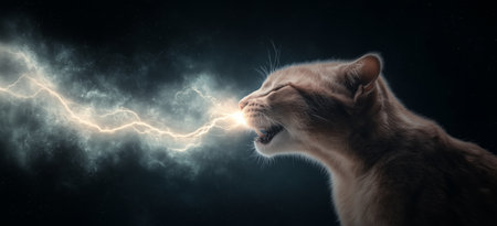 Cat emitting lightning on blue background with futuristic light beams and curves.