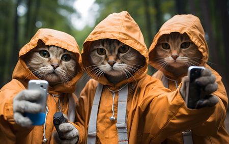 Three cats in raincoat taking selfie with mobile phone in the forest