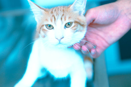 Cat with striking orange and blue lighting on face, close-up portrait in darkness. Dramatic feline gaze in studio light, artistic photography concept
