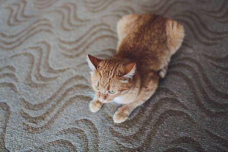 A curious tabby cat gazes upwards in the dim, atmospheric light.