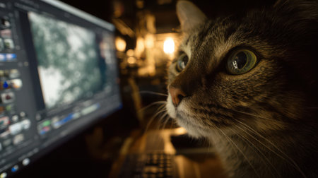 A close-up shot of a confused cat looking at a screen displaying abstract AI-generated art