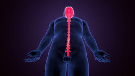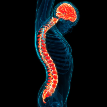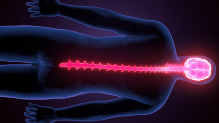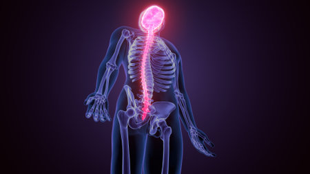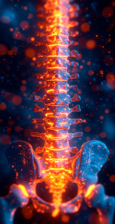 A vibrant digital portrayal showing the intricate structure of bones and nerves, with luminous accents emphasizing the spine and ribcage amid a moody, dark blurre