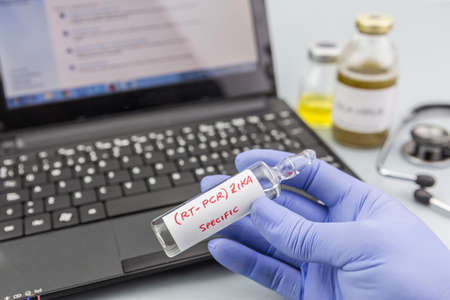 Scientist with blue latex gloves holds vials of ZIKA virus in laboratory for analysis