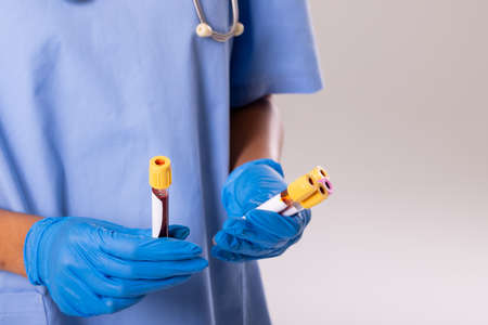 Midsection of african american mid adult female doctor wearing gloves holding test tubes, copy space. blood, medical, sample, laboratory, doctor, healthcare and medical occupation concept.
