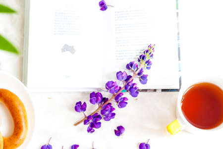 Sweet bagels and tender lupine flowers. Light composition with bright and purple flowers. A gentle and romantic morning with tea and a book. A book of poems for Breakfast.