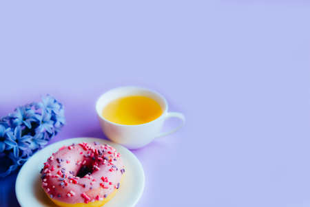 Pink sugar glazed donut, cup of tea and hyacinth flower on colorful background.