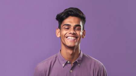 Smiling indian young man on lilac background. Generative Ai
