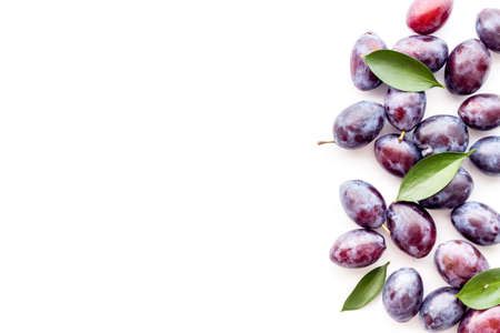Flat lay with fresh plums on white background, top view