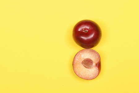 Ripe plum fruit isolated on yellow background. High resolution photo. Full depth of field.