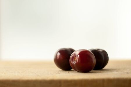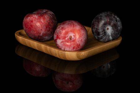 Group of three whole fresh red plum on wooden square plate isolated on black glass