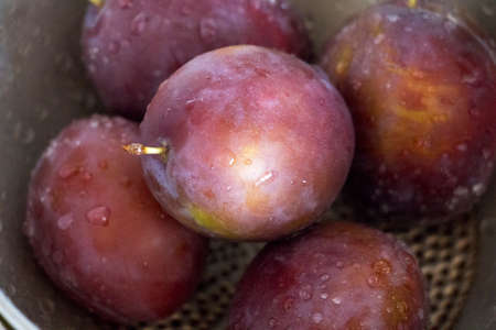 Fresh just washed plums in a bowl. Plums with drops