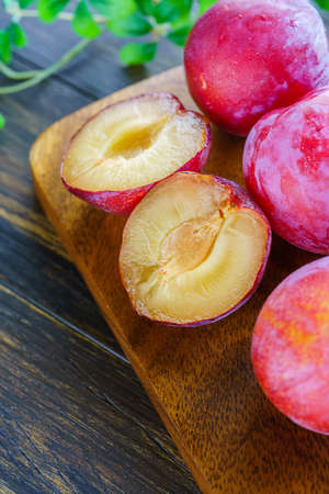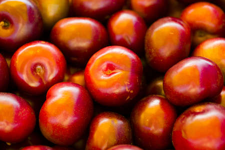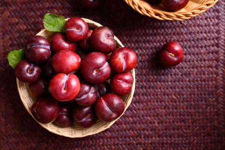 Sweet ripe red plums, healthy organic fruits close up