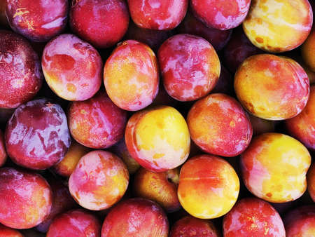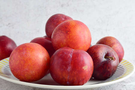 Fresh plums are yellow-red. Juicy and large. Purchase of goods for future use. Vitamins for immunity. On a light background. Copy space
