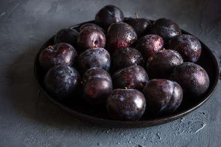 Blue plum in a plate on a dark background. Top view, place for text. Fruit background with copy space. Still life food.