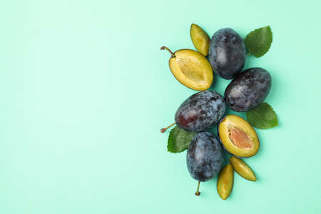 Fresh plums and leaves on mint background, top view