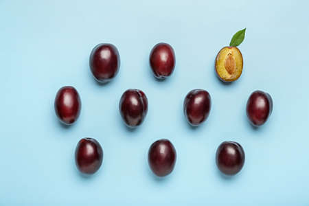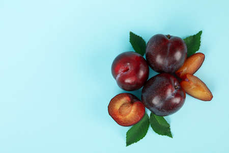 Group of fresh plums on a blue background