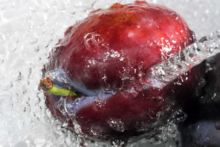 Ripe sweet plums are washed under a stream of clean water close up macro photography