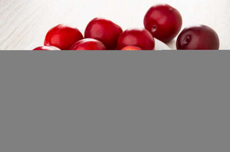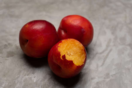 Group of fresh red plums on a gray background