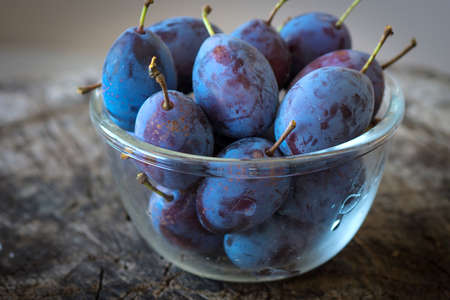 Close-up of ripe home plums on a wooden background in the garden. natural healthy vegan food