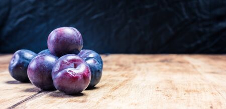Sweet, fresh, ripe plums on a wooden rustic table.