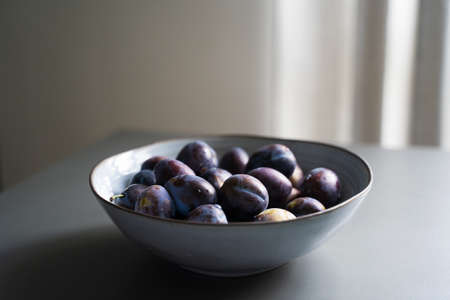 perspective view of fresh ripe plum fruits in vintage elegant grey bowl on table indoor minimalistic setup with natural light