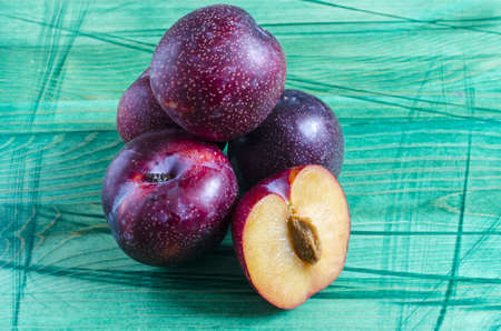 juicy plums and plums in the cut on a bright green wooden background close up