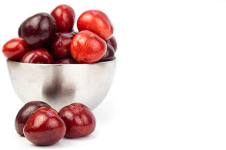 sweet cherry in a cup and a berry next to it on a white background. Greeting card with copy space.