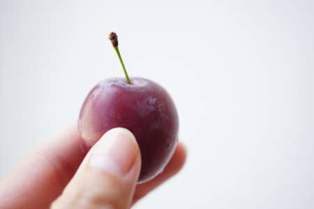 Ripe plum in human fingers on white background.